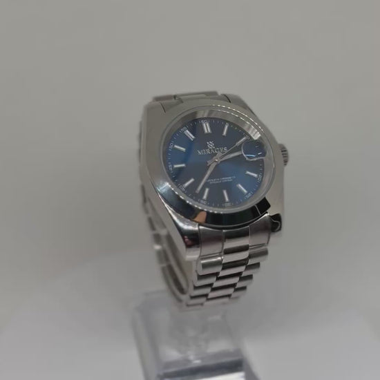 Presentamos el PRESTIGE con esfera azul y movimiento automático, un reloj automático meticulosamente elaborado para quienes aprecian la elegancia y la precisión. Este modelo cuenta con una esfera azul y una parte trasera transparente que permite vislumbrar el intrincado movimiento automático.