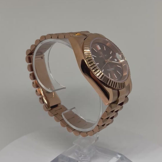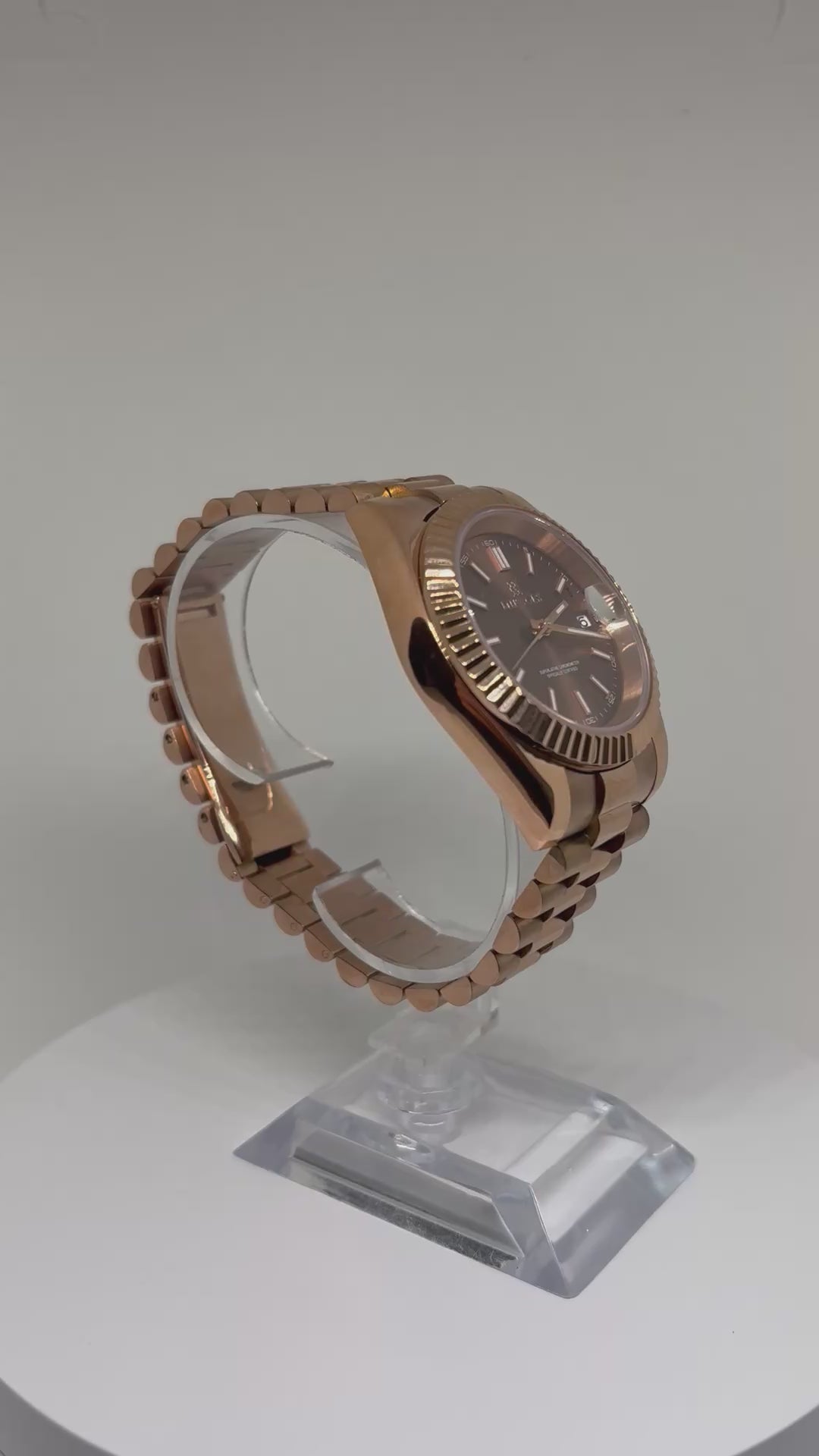 Presentamos el PRESTIGE con esfera marrón y movimiento automático, un reloj automático meticulosamente elaborado para quienes aprecian la elegancia y la precisión. Este modelo cuenta con una esfera marrón y una parte trasera transparente que permite vislumbrar el intrincado movimiento automático.